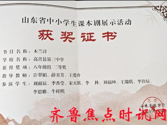 齐鲁焦点时讯(淄博)邵超 在全省中小学课本剧展示活动中,高青县第三中学师生凭借精彩演绎的课本剧《木兰诗》脱颖而出,荣获省二...