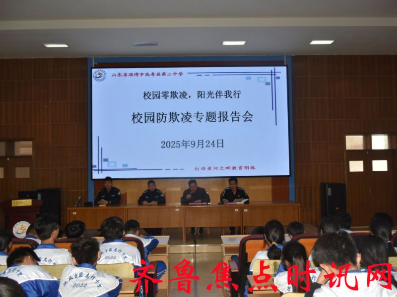 齐鲁焦点时讯(淄博)邵超 为强化学生法治观念,筑牢校园安全屏障,切实预防校园欺凌事件,9月24日,高青县第三中学特邀常家派出所2名警官,为全体学生开展防欺凌专题报告会,将法治教育与安全防护知识送到学生身边。