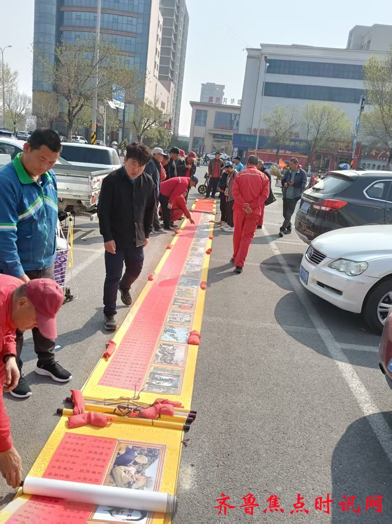 齐鲁焦点时讯 邵超 2019年9月28日下午,经过数月准备,六旬农民诗人韩文光创作的百米诗歌长卷在西城汽车西站外的广场上首次展出 。长卷