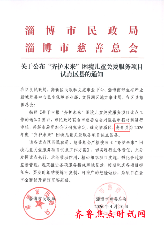 齐鲁焦点时讯邵超 4月10日,淄博市民政局、淄博市慈善总会联合印发《关于公布“齐护未来”困境儿童关爱服务项目试点区县的通知》,...