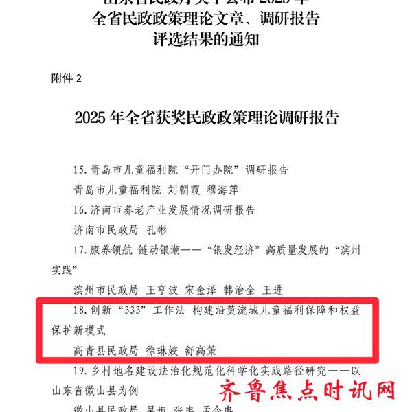 齐鲁焦点时讯(淄博)邵超 近日,山东省民政厅公布全省民政政策理论文章、调研报告评选结果,高青县民政局提报的《创新“333”工作...
