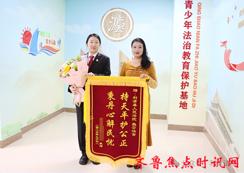 一起发生的生命权、身体权、健康权纠纷案件当事人家长,将“持天平护公正,秉丹心解民忧”的锦旗和一束鲜花送到法官魏芬手中