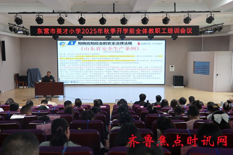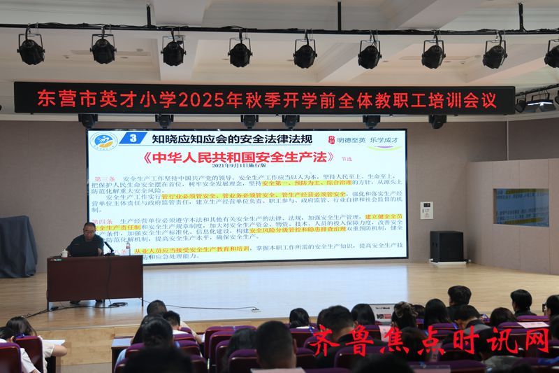 齐鲁焦点时讯(东营)邵超 8月28日,东营市英才小学开展2025年秋季开学前教职工全员安全培训,会上学校党支部书记、校长盖维秀传达了上级安全工作文件和精神,对进一步加强校园安全工作的各项细节作了全面部署,她结合近年来全国典型校园安全案例,深入剖析学校安全管理的各种风险点,并聚焦学生猝死事故,从事故诱因、责任判定,到特异体质学生管理预防,全方位筑牢校园安全基石。