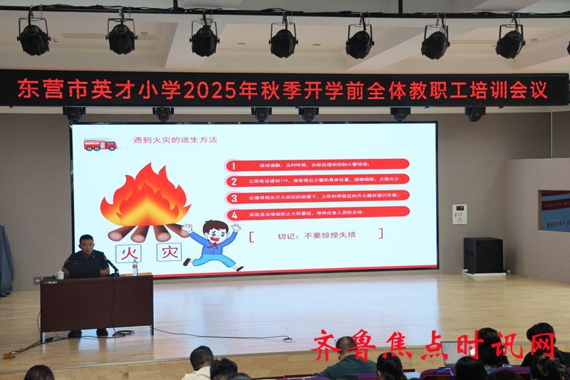 东营市英才小学特邀东营经济技术开发区消防救援大队到校开展春秋季期开学教职工消防安全专题培训,培训中教官重点传授火灾预防、逃生自救、应急疏散等要点,并与教职工互动,强化安全责任与风险防范意识。